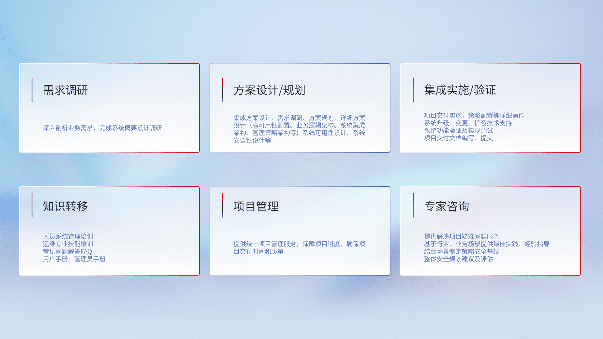针对客户行业特性,,,,将宏观的安全战略和需求,,,,通过专业的交付服务,,,实现项目落地,,,,为客户提供标准规范的集成交付服务。。。